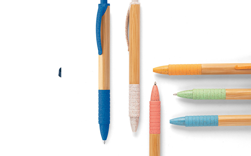 Caneta Fibra de Trigo e Abs Jamison elegante e ecológica, feita de bambu, com clipe antideslizante e detalhes coloridos em fibra de trigo e ABS. Oferece até 1,5 km de escrita suave em azul. Lembre-se, a cor e o resultado da impressão nos materiais naturais podem variar, tornando cada caneta única. Dimensões: 11 x 142 mm.