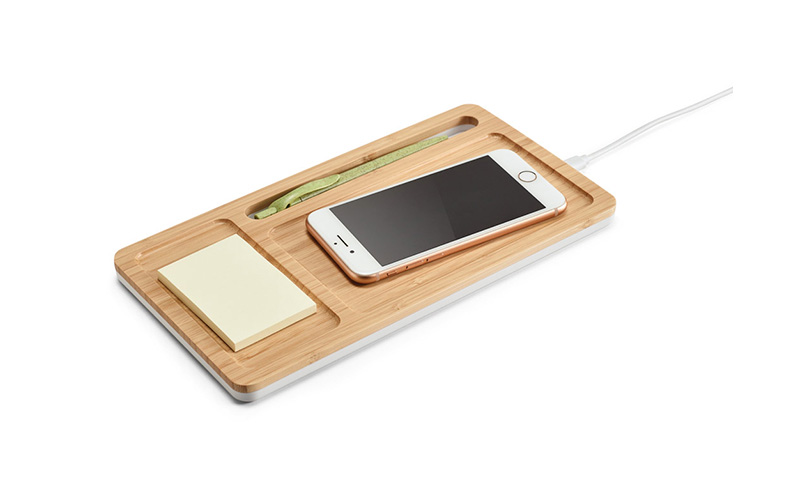 Desk Organizer Eco Shymp de bambu e ABS, este organizador personalizado de mesa é perfeito para manter sua mesa arrumada e seus dispositivos carregados. Inclui um carregador wireless super rápido com potência máxima de 15W. Possui um hub USB-A e suporte para celular. Uma porta de entrada USB-C e uma porta de saída USB-A. Inclui um cabo USB-C de 90 cm para carregamento. Funciona com smartphones que possuem tecnologia de carregamento sem fios. Fornecido em uma caixa presente elegante.