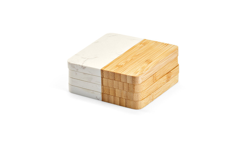 Kit para Mesa Servir Bem Mármore e Bambu Gracchusra, um toque de elegância à sua mesa com este kit para mesa personalizado com a sua marca, composto por 4 porta copos em formato quadrado, cada um dividido ao meio entre mármore e bambu. Este conjunto sofisticado é fornecido em uma caixa presente de papel kraft reciclado e possui certificação EU Food Grade. Note que a cor e o resultado da impressão nos materiais naturais podem variar entre os produtos. Medidas: 100 x 100 x 10 mm. Perfeito para proteger suas superfícies com estilo e sustentabilidade!